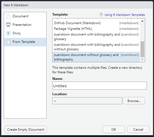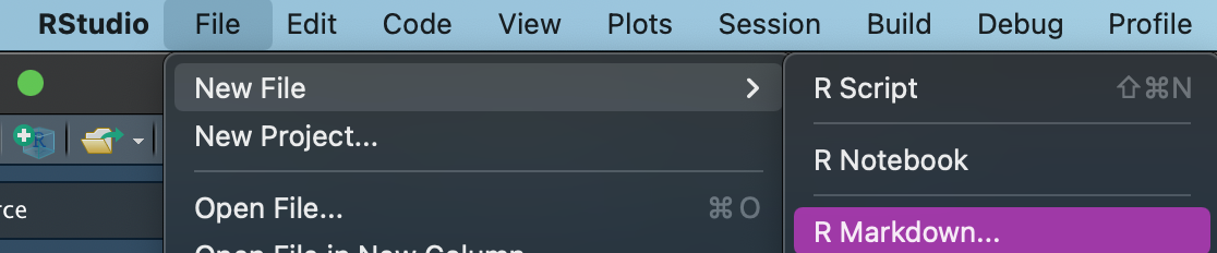 After installation, a new R Markdown template is available in R Studio. To open, use File, New File, R Markdown.